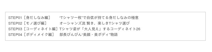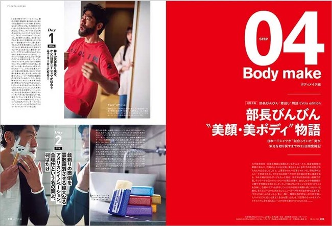ボディメイク編は、OCEANS名物企画「部長びんびん“着回し”物語」の特別編として展開。日本一Tシャツが似合っていた男・平山ユースケ部長が栄光を取り戻すまでの31日間奮闘記、題して「部長びんびん“美顔・美ボディ”物語」で、Tシャツを全方位的に総点検してください。
