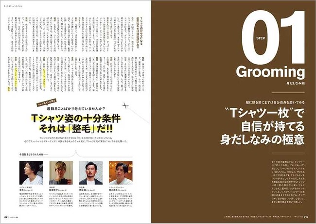 そして今年のタイトルは「すべてはTシャツのために」。Tシャツの企画会議で必ず出るのが「どんなものを選んでも、究極的にはいい体じゃないとTシャツって似合わないよね」という意見。そこで、Tシャツが似合うためのボディメンテナンス&グルーミング企画から特集をスタート。