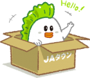 段ボールから「こんにちは」する何か農畜産物(商品)のような化身的存在。