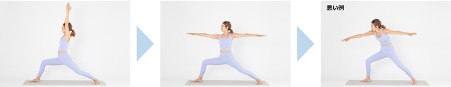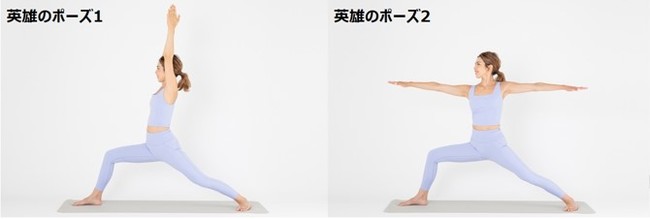 英雄のポーズ1と2を続けて行うポーズです。脚を大きく前後に広げ、前足と後ろ足のかかとが1直線になるように立ちます。前足のつま先は真っ直ぐ前に向き、後ろ足は斜め前向きになるように。おへそは前方を向き、骨盤が平行になるように保ちます。息を吸いながら両腕を上げ耳のラインに沿うように。指先が天井に伸びていることを意識します。この英雄のポーズ1から、吐く息で両手を肩の高さに広げ目線は前腕の先へ、後ろ足はかかとを軸にして横向きにして、英雄のポーズ2へ移行します。この動きを5回繰り返します。そして、右脚前から始めたら左脚前と、脚を組み替えてやりましょう。