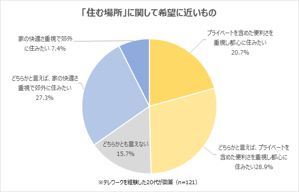 テレワークを経験した20代に、「住む場所」に関する希望をヒアリングしたところ、「プライベートを含めた便利さ重視で都心に住みたい」の回答が20.7%に上りました。「どちらかと言えば、プライベートを含めた便利さ重視で都心に住みたい」28.9%を合わせると、約半数が都心に住むことを希望していることが分かります。「新しいものに触れる機会が多い都会の方が、新しいアイディアを得られ、効率良く仕事ができると思う」「テレワークが増えたものの、プライベートで外出する利便性を考えると、都心に住みたい」「外出や買い物に便利な場所に住みたい」などの声が上がりました。