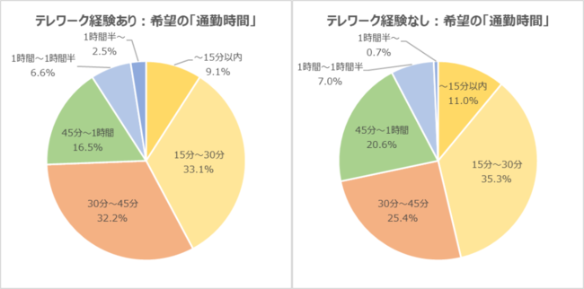 希望の通勤時間は、「15分~30分」が34.6%で最多。次いで、「30分~45分」27.5%が続きました。「通勤時間が短いほうが、残業をしても自分の時間を確保しやすい」「近い方が望ましいが、通勤時間があることで仕事のスイッチを入れることができる」「近すぎるとオンオフの区切りをつけにくい」などの声が寄せられました。通勤時間は短くしたいものの、通勤時間でオンオフの切り替えをしたいという意向が伺えます。テレワークを経験した人と、経験していない人では、通勤時間の希望に大きな変化は見られませんでした。