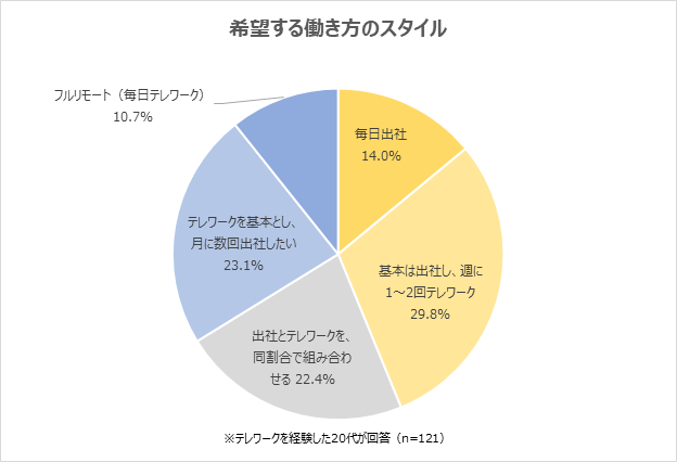 テレワークを経験した20代が希望する働き方は、「基本は出社し、週に1~2回テレワーク」が29.8%で最多。次いで、「テレワークを基本とし、月に数回出社したい」23.1%、「出社とテレワークを同割合で組み合わせる」22.4%が続きました。出社とテレワークを組み合わせて働きたいと回答した20代が75.3%に上ります。「毎日出社」は14.0%、「フルリモート(毎日テレワーク)」は10.7%でした。