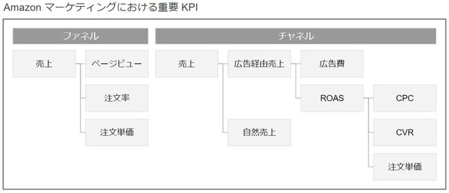 Amazon マーケティングの日々の分析において売上に増減があった際、売上を構成する各重要KPIのどこに変化があったかを特定し、適切な施策を実行していくことが重要です。