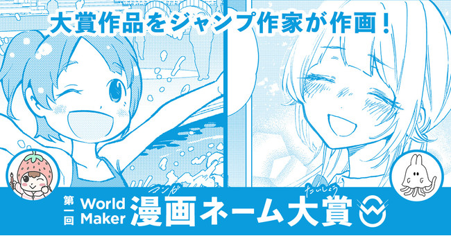 「World Maker」β版のリリースを記念して実施された「第一回 World Maker 漫画ネーム大賞」では1.どこか奇妙な異世界ファンタジー、2.ある夏の日常について、3.続きが気になる4ページの漫画、の3つのテーマのうち、どれかの課題に沿った1~4ページの「World Maker」でつくった漫画ネームを募集。7,500点を超える応募作品の中から選ばれた大賞2作品は、宇佐崎しろ先生と大石浩二先生が作画をし、6月6日より「少年ジャンプ+」にて掲載されます。また受賞者の2名には30万円の賞金も贈呈されました。