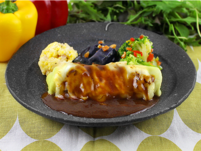シャキシャキした歯ごたえのあるキャベツと、相性の良い豚肉を包んだロールキャベツをご用意しました。ソースはコクのあるデミグラスソースに隠し味に赤ワインを入れることにより、深みのある味わいに仕上げております。とろけるチーズがトッピングしてあり、より満足できるプレートです。よく絡めてお召し上がり下さい。