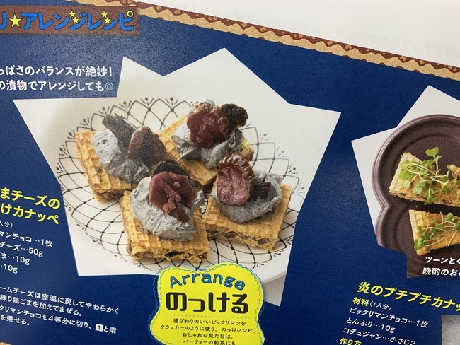 右は、クラッカーに見立てたビックリマンチョコに練り黒ごまをまぜたクリームチーズと柴漬けをのせたもの。これがくせになるおいしさなんです!(【悪魔編】p.22)