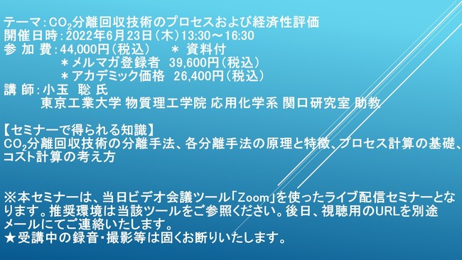先端技術情報や市場情報を提供している(株)シーエムシー・リサーチ(千代田区神田錦町: https://cmcre.com/ )では、 各種材料・化学品などの市場動向・技術動向のセミナーや書籍発行を行っておりますが、 このたび「CO2分離回収技術のプロセスおよび経済性評価」と題するセミナーを、 講師に小玉 聡 氏 東京工業大学 物質理工学院 応用化学系 関口研究室 助教)をお迎えし、2022年6月23日(木)13:30より、 ZOOMを利用したライブ配信で開催いたします。 受講料は、 一般:44,000円(税込)、 弊社メルマガ会員:39,600円(税込)、 アカデミック価格は26,400円(税込)となっております(資料付)。