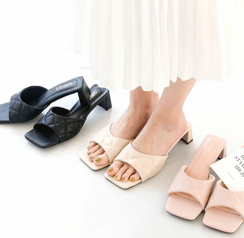 【1位】minkymeee/スクエアトゥキルティング ミュールサンダル