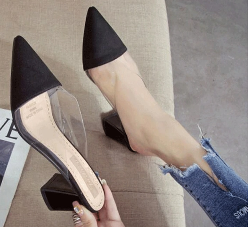 アッパー両サイドのクリア素材が、足元のキレイ見せを演出。チャンキーヒールで、カジュアルにもエレガントにもマッチ。