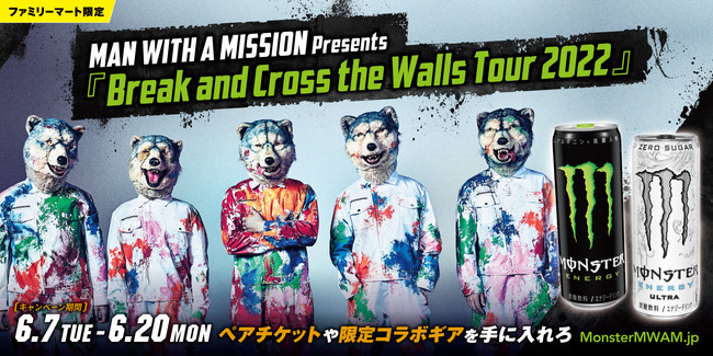 モンスターエナジーは、6月7日(火)~6月20日(月)の期間中、5月25日(水)発売のMAN WITH A MISSIONのニューアルバム「Break and Cross the Walls II」を携えた全国ツアーを祝し「Break and Cross the Walls Tour 2022 キャンペーン」を開催いたします。
