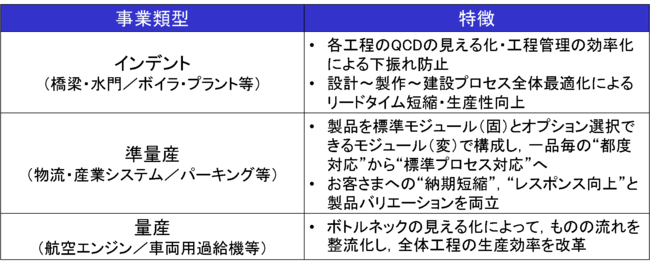 IHIグループは幅広い製品を手掛けるコングロマリット企業であり,事業を「量産系(ジェットエンジン等)」「準量産系(カスタマイズを旨とする産業機械等)」「インデント系(橋梁や発電プラント等)」の3類型に分類し,各々の特性に合わせたデジタル化を通じた業務プロセス改革を図っています。特に,準量産系については,「固変分離(製品を標準化でリードタイム短縮を図るモジュール(固)と,オプションの選択(選),カスタマイズを前提としたモジュール(変)に分ける考え方)」の思想と「標準業務プロセス」の適用を進めることにより,上記のLCBの拡大とも連動しつつ,お客さまへの素早いフォローを可能とすることを目指しています。