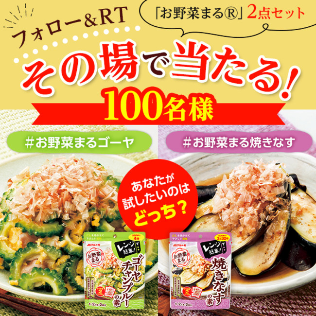 マルトモ株式会社(社長:今井均 本社:愛媛県伊予市)は、春夏限定商品「お野菜まる(R)ゴーヤチャンプルーの素」「お野菜まる(R)焼きなすの素」のセットが抽選で合計100名様にその場で当たる、フォロー&リツイートキャンペーンを実施します。