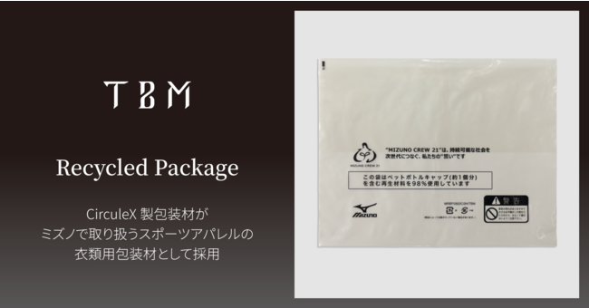 株式会社TBM(本社:東京都千代田区、代表取締役CEO:山崎敦義、以下TBM)の、使用済みペットボトルキャップやストレッチフィルムを原料とした再生材料98%の「CirculeX(サーキュレックス)」製包装材が、ミズノ株式会社(本社:大阪府大阪市、代表取締役社長:水野明人、以下ミズノ)が取り扱う一部の国内生産スポーツアパレルの衣類用包装材に採用されました。2022年6月より、順次切り替えが進められていきます。