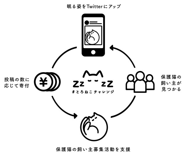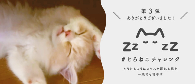 眠る猫の写真や映像に「#とろねこチャレンジ」というハッシュタグをつけてSNSに投稿すると、1投稿につき10円が保護猫の譲渡活動に寄付される仕組みです(第3弾はTwitterのみが対象)。2020年2月から4月にかけて実施した第1弾、2020年10月から11月にかけて実施した第2弾と合わせて、これまでに累計453,269件の投稿が集まりました。