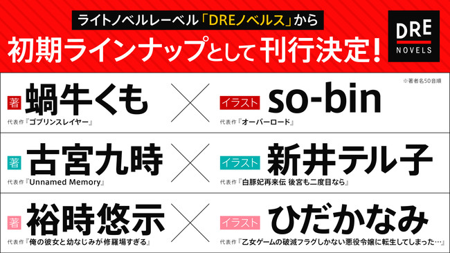 ライトノベルレーベル「DREノベルス」の初期ラインナップとして、『ゴブリンスレイヤー』の著者・蝸牛くも先生と、『オーバーロード』のイラストレーター・so-bin先生が初めてタッグを組む新作小説を含む、3作品の刊行が決定いたしました。タイトルと発売日のほか、詳細は後日発表いたしますので、ぜひご注目ください。