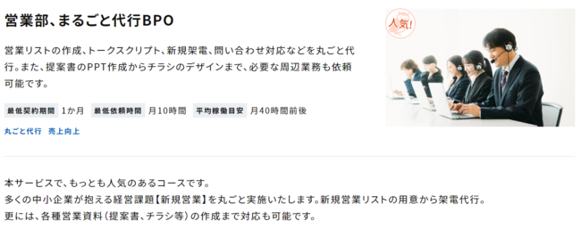 「すぐに利用できる、すぐに成果を出せる」をコンセプトとした中小企業特化型のBPOサービスです。