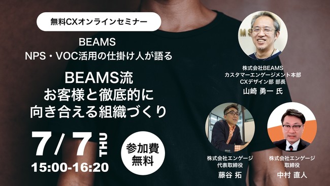 株式会社エンゲージ(代表取締役:藤谷拓、以下エンゲージ)は、2022年7月7日(木)に、アパレルを中心とした小売業・サービス業の担当者・マネージャー・経営者の方々を対象に、株式会社BEAMS(以下BEAMS)より山崎勇一氏をお招きしたCX向上・従業員エンゲージメント向上に役立つ無料オンラインセミナーを開催いたします。