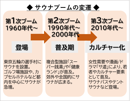 1960年代に、東京五輪の選手村にサウナが設置されたことを契機に、首都圏を中心にゴルフ場施設などにサウナが設置され始め、その後第2次ブームの時期には、郊外にも「スーパー銭湯」や「健康ランド」といった食事や宿泊など家族やグループで楽しめる大型施設が普及し、サウナ人気も一気に高まりました。