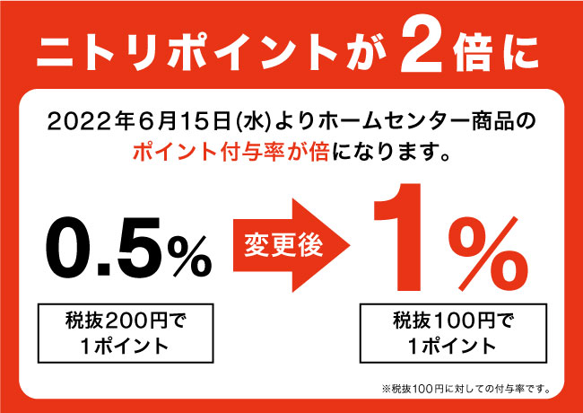 株式会社島忠(本社:さいたま市中央区 代表取締役社長:岡野恭明 以下:島忠)より、ホームセンター商品のニトリポイント付与率を従来の0.5%(200円(税抜)につき1ポイント)から、本日、6月15日(水)より、2倍の1%(100円(税抜)につき1ポイント)に変更いたしましたことをお知らせいたします。