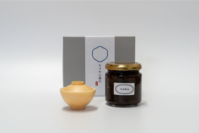 有田焼のふた付き茶わんの形をした香ばしい最中の皮と、佐賀の老舗菓子店「鶴屋」の風味豊かなつぶあんの瓶詰めセットです。