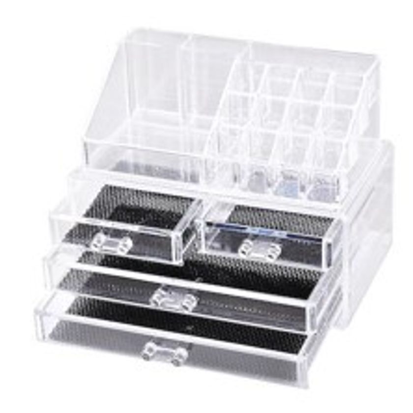 サイズ別に分かれた引き出しと仕切りがあり、コスメを種類別に収納できるスタンド。透明なアクリル製なので、コスメのかわいいパッケージを見せる形で収納できるのもポイント。