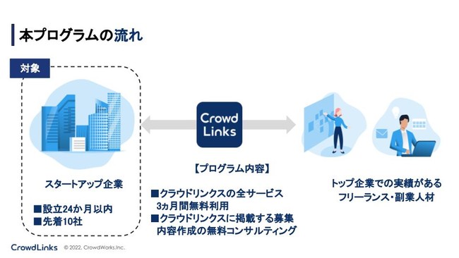 企業と個人をつなぐオンライン人材マッチングプラットフォームを開発・運営する株式会社クラウドワークス(本社:東京都渋谷区 代表取締役社長 兼 CEO:吉田 浩一郎 以下「当社」)が運営するハイクラスな副業・兼業マッチングプラットフォーム「CrowdLinks(クラウドリンクス)」(以下「クラウドリンクス」)は、2022年6月16日より、設立24か月以内のスタートアップ企業を対象として3か月間限定でサービスを無料で利用できる「スタートアップ×副業マッチングプログラム」を開始します。
