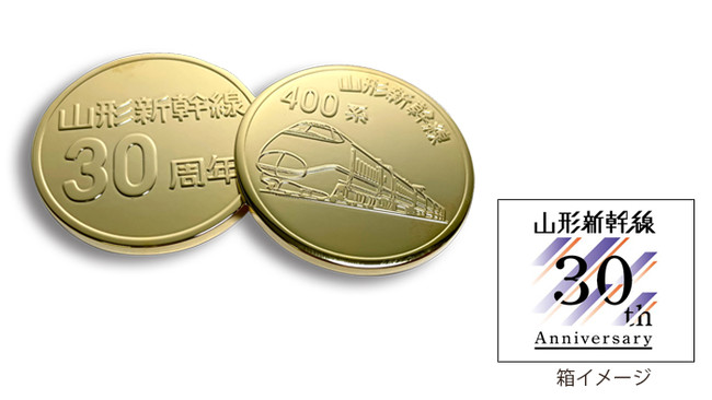 ゴールドの記念コインに400系新幹線をデザインしました。裏面は「山形新幹線開業30周年」のメモリアルなデザインです。ロゴマーク外装箱付きです。