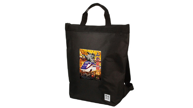ブラックのボディに総天然色のオリジナルグッズデザインが目をひきます。バックパックと手提の2WAYで使用できます。
