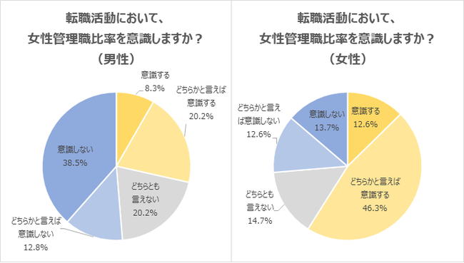 転職活動において、女性管理職比率を「意識する」「どちらかと言えば意識する」と回答した20代が42.1%を占めました。転職活動において、4割超の20代が、女性管理職比率を意識していることが分かります。男女別では、「意識する」「どちらかと言えば意識する」と回答した割合が、男性は28.5%、女性は58.9%となりました。6割弱の20代女性が「意識する」としており、関心の高さが伺えます。