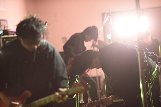 タイトなダンスビートで画面越しにオーディエンスを踊らせる「SとF」を軽快に鳴らすと、4人一斉に爆音をぶちかまして「ニヒリズム」へ。持ち場を離れて森に近づいた加藤が長髪を振り乱し、飛び跳ねながらギターをかき鳴らす。森は体全体を大きく揺らしながらベースを弾き、古舘は顔を顰めながら声を振り絞る。ヒリヒリとした焦燥感と熱情がここに来てライブの温度をさらに高める。