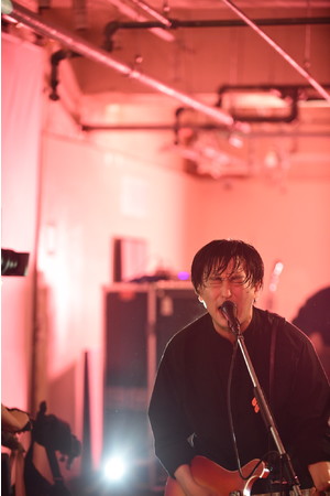 縦長のスペースなので奥から吉田、ベースの森夏彦、ギターの加藤綾太が並び、先頭に古舘。あんまり見たことのない配置で、アイコンタクトとか取りづらいんじゃないの、とも思うのだが、そんなことものともしない勢いと阿吽の呼吸でパンクな「ルシファー」にセンチメンタルな「急行電車」と、彼らのライブでは鉄板の楽曲を畳み掛けていく序盤。古舘の前髪はあっという間に汗まみれになっている。