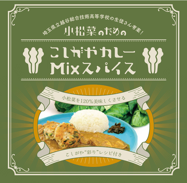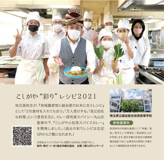 越谷市が地場農産物の普及を目的とした事業「こしがや“彩り”レシピ2021」の一環として、埼玉県立越谷総合技術高等学校食物調理科の生徒が中心となり開発したもの。カレーのスペシャリスト「カレー研究家スパイシー丸山」監修の下、地元農家や地元レストランのシェフの協力を得ながら、2022年3月に『こしがや小松菜スパイスカレー』が完成しました。レシピ開発に取り組む様子は、越谷市公式YouTubeチャンネルにて配信しています。