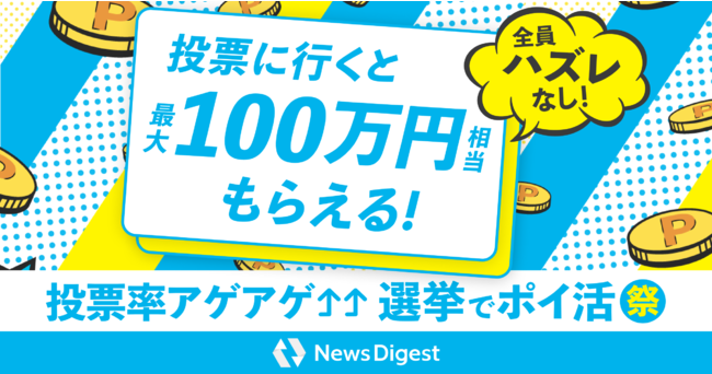 投票に行くと、最大100万円もらえる!NewsDigestアプリ「投票率アゲアゲ!選挙でポイ活祭」を開始
