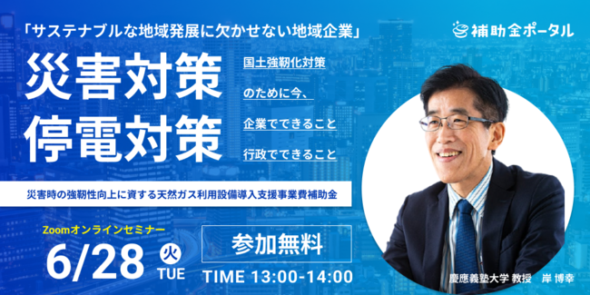 株式会社補助金ポータル(本社:東京都渋谷区、代表取締役:福井彰次)はスペシャルゲストに「岸 博幸氏」を迎え、一般社団法人日本ガス協会および一般社団法人 都市ガス振興センターと「サステナブルな地域発展に欠かせない地域企業による「災害対策・停電対策」をテーマに無料オンラインセミナーを開催します。