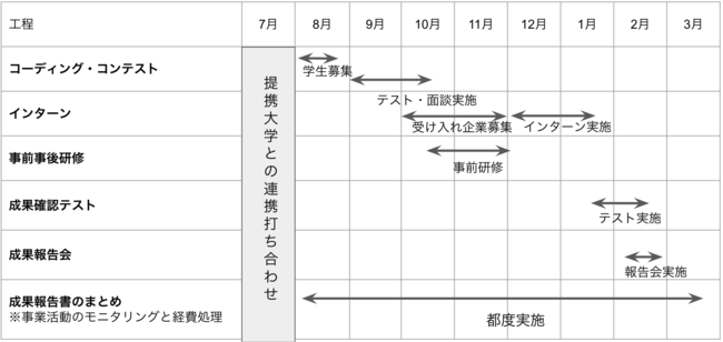 本事業では、事業対象地域在住のITスキルを有する学生等を対象に、コーディング・コンテスト及び人材育成を実施します。具体的には、経済産業省の指示に基づき、以下の6つの業務の取りまとめを行います。