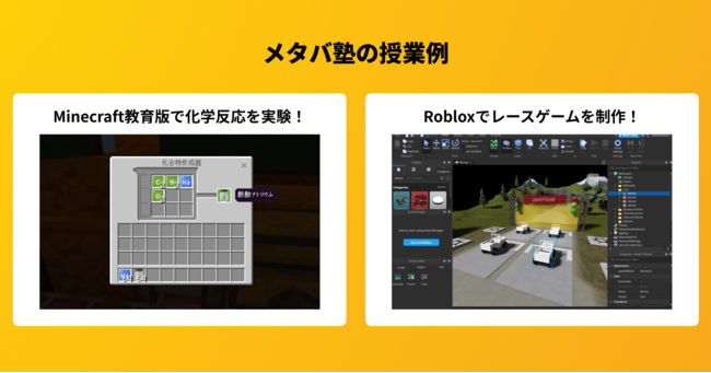 そこで私たちは教材をゲーミフィケーションするのではなく、ゲームを教材化することを目指しました。ゲームやメタバースが持っている「世界のルールをつくることができる」性質は頭の中の想像を実現したり主体的な学びを促進できます。そして体験格差の解消と次の一歩を踏み出すキッカケづくりとして、メタバースとゲームを学びのツールとしたメタバ塾が誕生しました。
