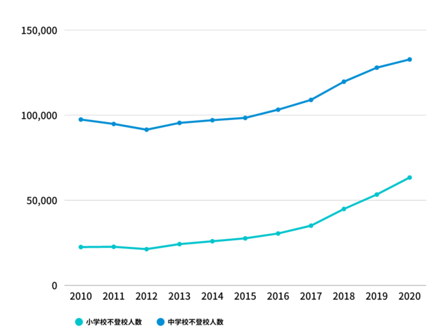 文部科学省の令和2年度の発表によると小中学生の不登校児童数は過去最多の196,127人(※1)となっております。高校生の不登校児童数を合わせると約24万人に登ります。また日本財団の調査によると「不登校傾向」にある中学生の人数は約33万人とされており(※2)、近年不登校支援の重要度が高まっています。