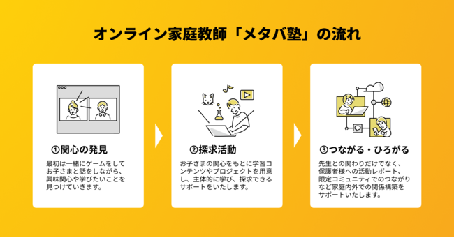 メタバ塾は不登校のお子さんを対象にしたメタバースとゲームによるオンライン家庭教師です。興味関心による「探求」と新たな選択肢の「発見」を通し、次の一歩へのキッカケをサポートすることを目指しています。元不登校経験者やゲームの造詣が深い講師が授業を担当し、不登校のお子さんに伴走しながら挑戦や学びを支えます。保護者様には授業のレポートを通してお子さんの家庭外での姿や第三者である講師から見えた関心や得意、成長などをお伝えします。