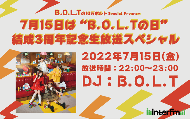 InterFM897(TOKYO:89.7MHz)は、2022年7月15日に「B.O.L.Tの10万ボルト」Special Program 『7月15日は“B.O.L.Tの日” 結成3周年記念生放送スペシャル』を放送すること、また、同番組の過去アーカイブ音声データの「NFT」での販売が決定しましたことをお知らせ致します。