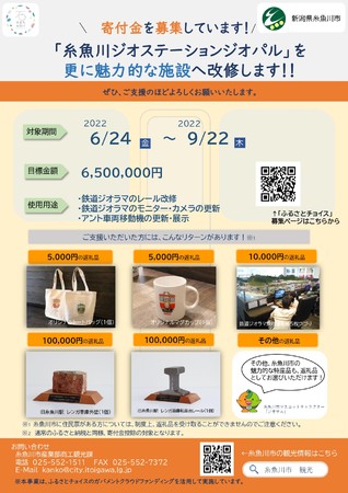 令和4年度に予定している、糸魚川ジオステーションジオパルにおける各種整備事業について、ガバメントクラウドファンディングを活用して支援を募ることとなりました。