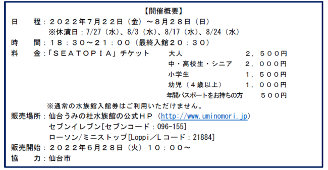 また、ナイトアクアリウムシアター「SEATOPIA」のチケットは、お客さまに安心してお楽しみいただけるよう、前売制で販売し、感染症対策を徹底して開催いたします。ニューノーマルに対応した『仙台うみの杜水族館』ならではのプレミアムな非日常体験をお届けいたします。