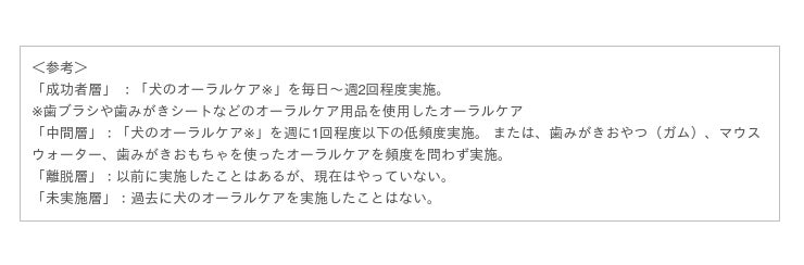 犬のオーラルケアを毎日~週2回程度実施していて、歯みがき用品を使ってワンちゃんのお口の中をしっかりケアできている「成功者層」は、全体のわずか20.7%。