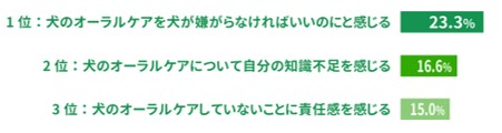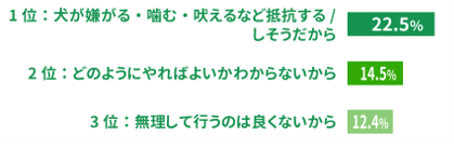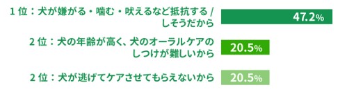 第2位には「犬の年齢が高く、犬のオーラルケアのしつけが難しいから」と「犬が逃げてケアをさせてもらえないから」の2つの理由が、それぞれ20.5%の割合を占め、ランクイン。