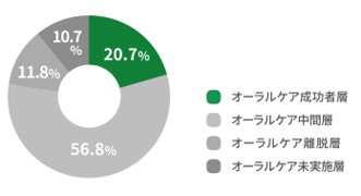 一方で、成功に向けて奮闘したり、時には立ち止まったりと不定期なオーラルケアを実施している「中間層」は56.8%、諦めてやめてしまった「離脱層」は11.8%、まだやったことがない「未実施層」は10.7%となりました。