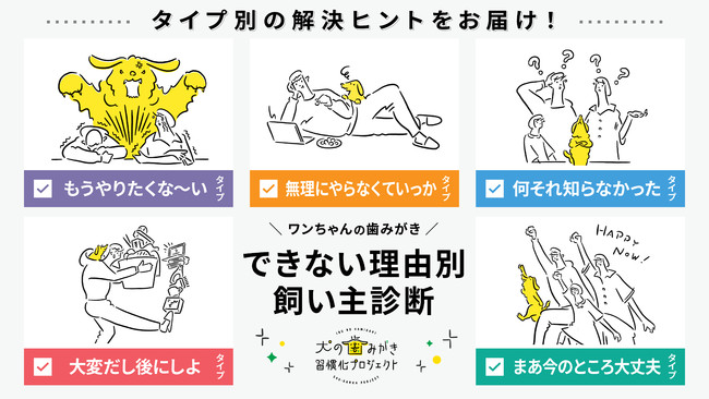 6月28日(火)を皮切りにオープンする「犬の歯みがき習慣化プロジェクト」の特設サイトでは、「犬のオーラルケア」に興味のある飼い主さん向けに、失敗した理由やできない理由をチェックするだけで全5つのタイプ別診断ができ、それぞれの飼い主さんに合わせた“解決ヒント”をお届けする、お助けコンテンツをスタートいたします。