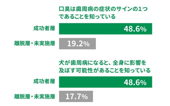 なかでも、ランクインした「口臭は歯周病の症状のサインの1つであることを知っている」や「ワンちゃんが歯周病になると、全身に影響を及ぼす可能性があることを知っている」、成功者層はこのどちらについても群を抜いて‘半数近くも’知識があり、一方で両項目ともに、離脱層や未実施層の知識は約20%に留まりました。