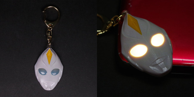 裏から光を当てると目が光る!ダイナのフェイス型キーホルダーが登場!