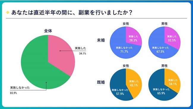 また、男性で未婚の方の副業実施率は32.5%、既婚の方の副業実施率は34.1%となりました。女性は、未婚の方の副業実施率が28.3%、既婚の方の副業実施率が42.1%となり、男性・女性ともに既婚者の方が副業を行っている人が多いことが明らかになりました。
