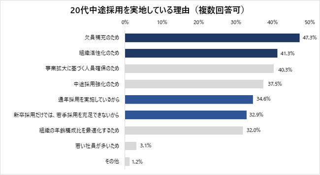 (1) 20代中途採用を実施する理由は「欠員補充のため」が47.3%で最多。「通年採用を実施しているから」も3割超